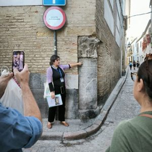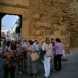 Las paradas fueron: plaza Jerónimo Páez, antiguo convento de santa Clara, pedestal esquina calle Encarnación, patio de la Mezquita Catedral (no pensamos entrar dada la hora, pero la encontramos aún abierta por unos minutos) con rumbo a los miliarios que flanquean la Puerta de las Palmas, desvelando que Almanzor construyó un aljibe bajo el patio hoy llamado «de los Naranjos» y cómo es, gracias a labor de reciente hemeroteca que le dió cobertura vía reportaje.