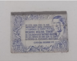 En la calle Lineros, 26 encontramos este homenaje a Ricardo Molina. Nacido en Puente Genil, con 8 años, en 1925, su familia se trasladó a Córdoba. A pesar de su temprana muerte, en1968, con solo 51 años, su legado es imborrable. Licenciado en Historia, ejerció como profesor en nuestra ciudad, será miembro de la mejor generación de poetas cordobeses, alma de la revista Cántico fundada en 1947 y colaborador en el diario Córdoba bajo el pseudónimo de Eugenio Solís.