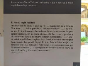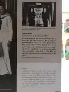 En este homenaje divulgativo y a la vez profundo por el universo lorquiano descubrirás el lado más humano y sincero del escritor andaluz autor de obras maestras como Romancero Gitano y la casa de Bernarda Alba. Verás fotos poco conocidas de él (como una de adolescente, con acné) y lo conocerás mejor tanto a través de pensamientos y reflexiones propias “de su puño y letra” (fragmentos de cartas enviadas a familiares y amigos, conversaciones, declaraciones a diferentes medios de la época, etc) como de testimonios de contemporáneos que lo trataron, que se van intercalando en el relato expositivo. Es el caso de su hermano Francisco, Jorge Guillén, Luis Cernuda o Flor Loynaz – a propósito esta última de su estancia en Cuba en 1930 – . No pases por alto el poema que le dedicó Dámaso Alonso y la interesante descripción que de él hace Pablo Sueiro.