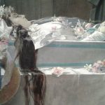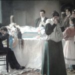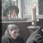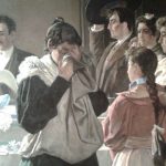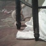 7- Numerosos DETALLES COSTUMBRISTAS dan vida y realismo a la escena, la hacen «creíble», otros nos demuestran el pintor de calidades que fue: ese AIRE que entra con fuerza por la ventana abierta y mueve (amenazando con apagarlas) las dos velas que custodian el féretro, llevan un rato encendidas, – fíjate en la CERA derretida que ha llegado hasta el suelo y formado una mancha -,sus bellos ADORNOS FLORALES, la caída de los PLIEGUES,