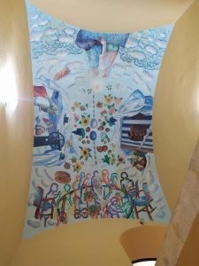 Hola, porque confiamos en tus infalibles dotes de observación y para empezar la semana con una nota artística y a todo color, aquí tienes esta pintura. Cubre el techo de la escalera…. 👉¿de?👈 realizada por el artista cordobés (de Peñarroya Pueblonuevo) Salvador Morera, su firma se sostiene en las nubes (¿la ves?).