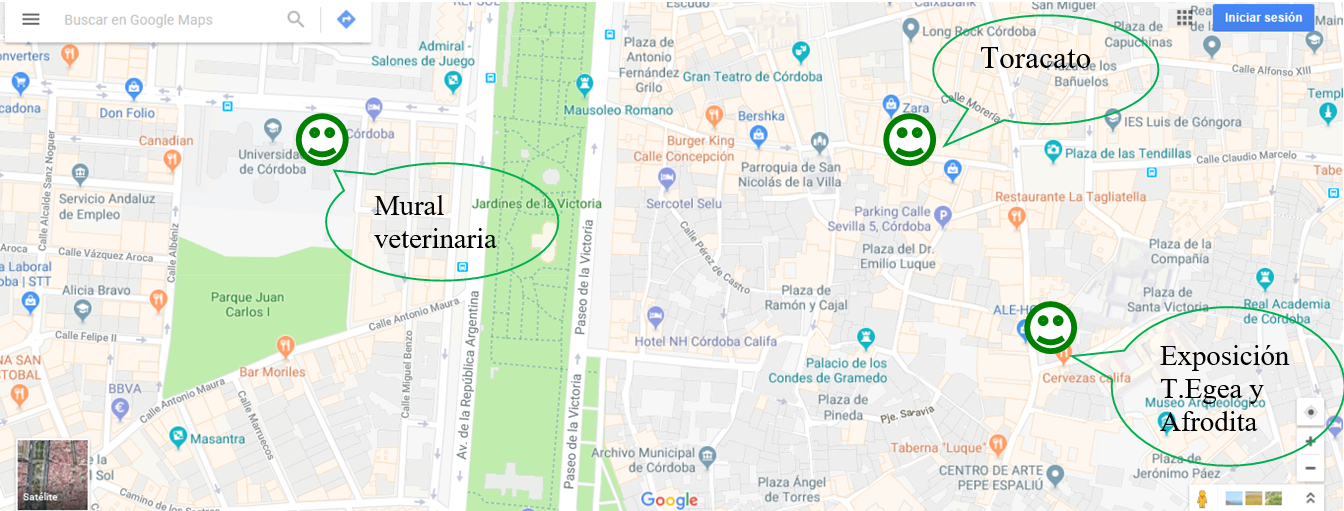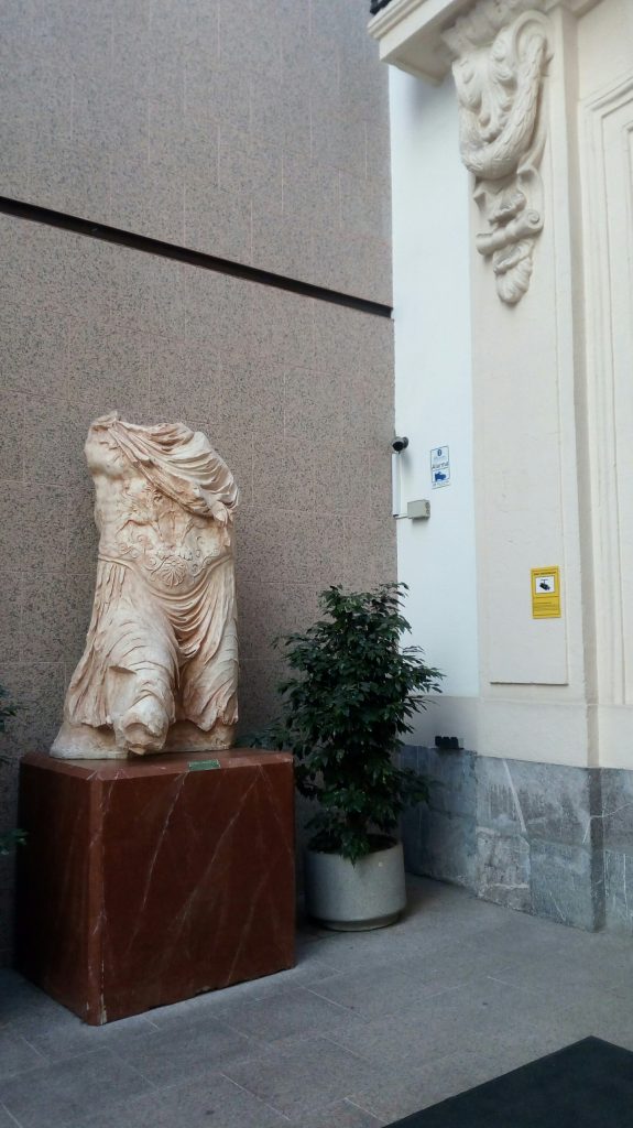 … y hablando de sacar el arte a la calle, algo rezagada pero imponente junto a la verja de acceso a la sede de la exposición, Vimcorsa (Viviendas Municipales de Córdoba), antes Casa Carbonell, y antes aún casa natal de Ángel de Saavedra, el duque de Rivas, – de ahí el nombre de esta calle -, está la escultura de la diosa romana del Amor, Afrodita agachada, ¿te acuerdas de ella?, ya la conocimos al hablar de los baños andalusíes de la calle Cara, donde apareció la original que se exhibe en el Museo Arqueológico. Ésta es una copia, ¿en qué material, escayola? ¿y por qué está precisamente aquí?, no lo sabemos, ningún panel nos informa. No es la única gran escultura clásica cordobesa que está exhibida, en copia, en algún rincón de nuestro casco histórico, Patrimonio de la Humanidad…. ejemplo cercano -en la calle Gondomar, concretamente en el hall de la actual Delegación de Hacienda y Agencia Tributaria de la Junta de Andalucía – es el magnífico toracato (el original, en mármol blanco, fechado en época del emperador Claudio, mediados s. I d.C., y descubierto en 1892 en la vecina calle Morería, está en nuestro Museo Arqueológico también, eso sí, no expuesto actualmente): ¿cómo sería la estatua original, de dimensiones colosales, teniendo en cuanto que solo se conserva su torso y tiene 1,90 m. de altura? ¿cuándo se realizó y para qué lugar? ¿sabemos quien era este personaje y por qué se puede identificar?, ¿existen ejemplos paralelos con quien compararlo? ¿qué está representado en la fina labra de su coraza?, ¿cómo iría policromado? Investiga en la web arqueocordoba, porque es una pieza bien analizada por el Dpto. de Arqueología de nuestra Universidad, fuente fiable donde las haya.