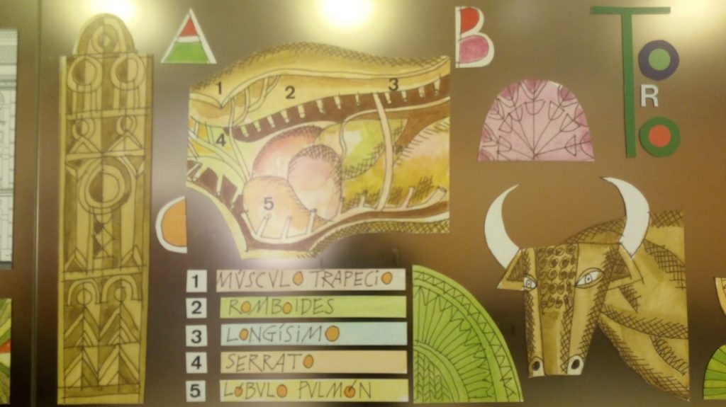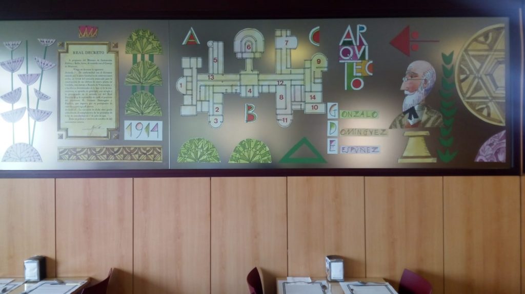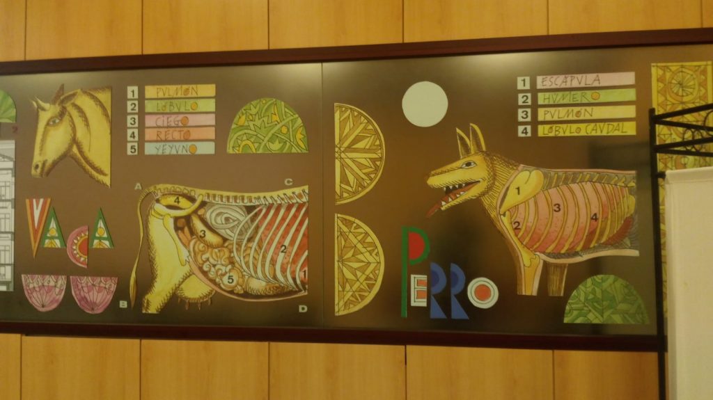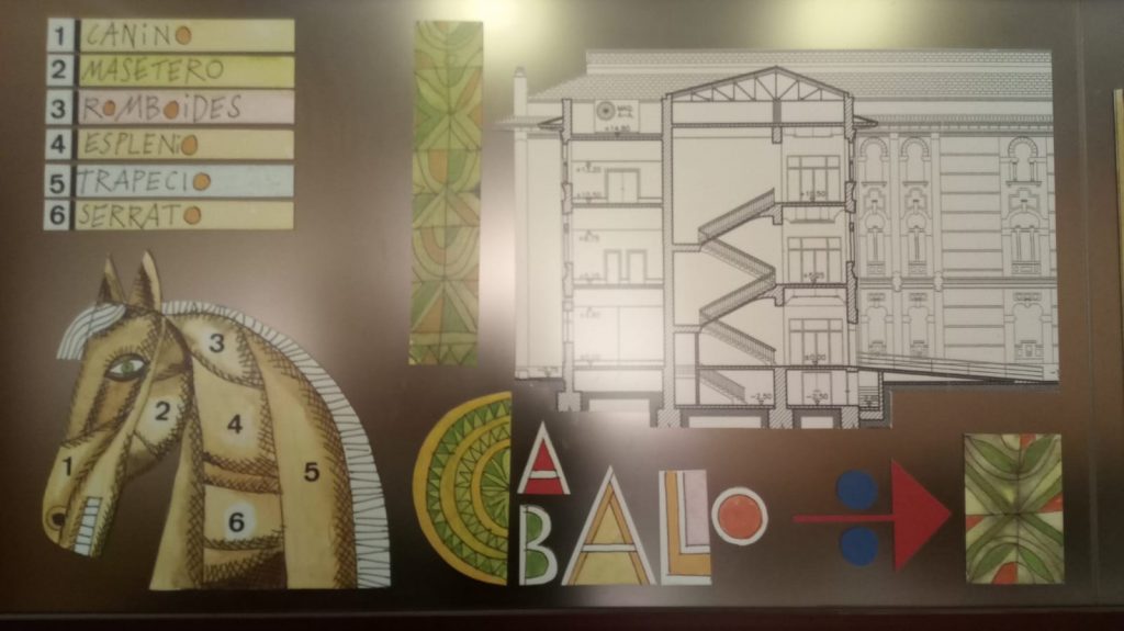 Aquí te incluimos, como ejemplo, imágenes de su mural para la antigua facultad de Veterinaria de Córdoba, que fue una de las más prestigiosas de España, bello edificio regionalista, actual Rectorado; concretamente está en su restaurante: fíjate qué didáctica y original presentación, en extensión, hace Egea – ¿encuentras en él el año de ejecución y su firma? – de la trayectoria histórica del edificio, sus características decorativas, sus promotores, su singular arquitectura, tanto en planta como alzado, intercalado con dibujos que “diseccionan” la anatomía del perro, la vaca, el cerdo, el caballo… y ¿Cuál falta? como recuerdo de los estudios académicos que aquí se impartían, con los animales como protagonistas, ¿cuando dejó de ser sede de esta facultad? y ¿el busto de qué arabista está en sus jardines exteriores, ¿sabes por qué? También “incluye” en esta panorámica gráfica el edificio de espectáculos de la Córdoba romana que descansa aquí debajo, a varios metros de profundidad – y en las inmediaciones, porque era de colosales dimensiones -. Descubierto parcialmente, a nivel de cimentación, muy arrasado, está a la luz, (solo testimonialmente, en deplorable estado, abandonado, “ilegible” …. olvidado por las Instituciones, carente de ningún proyecto de puesta en valor…) lindante con los jardines Juan Carlos I, justo en la trasera a la fachada principal del Rectorado, “machacado” también al construir sobre él el espacioso salón de actos del Rectorado. ¿De qué edificio se trata? Egea te lo escribe, acompañado de un tal ACTIUS que… para conocerlo mejor tendrás que ir a nuestro Museo Arqueológico – al área donde están expuestos los epígrafes funerarios de época romana –, allí está la respuesta de quien es y su relación con este enclave y barrio.
