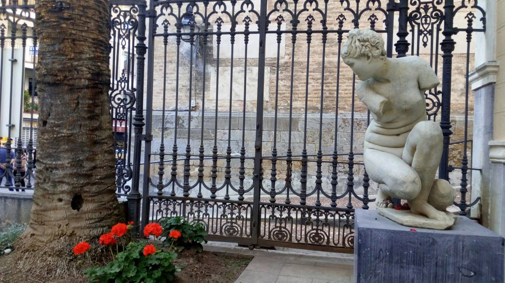 … y hablando de sacar el arte a la calle, algo rezagada pero imponente junto a la verja de acceso a la sede de la exposición, Vimcorsa (Viviendas Municipales de Córdoba), antes Casa Carbonell, y antes aún casa natal de Ángel de Saavedra, el duque de Rivas, – de ahí el nombre de esta calle -, está la escultura de la diosa romana del Amor, Afrodita agachada, ¿te acuerdas de ella?, ya la conocimos al hablar de los baños andalusíes de la calle Cara, donde apareció la original que se exhibe en el Museo Arqueológico. Ésta es una copia, ¿en qué material, escayola? ¿y por qué está precisamente aquí?, no lo sabemos, ningún panel nos informa. No es la única gran escultura clásica cordobesa que está exhibida, en copia, en algún rincón de nuestro casco histórico, Patrimonio de la Humanidad…. ejemplo cercano -en la calle Gondomar, concretamente en el hall de la actual Delegación de Hacienda y Agencia Tributaria de la Junta de Andalucía – es el magnífico toracato (el original, en mármol blanco, fechado en época del emperador Claudio, mediados s. I d.C., y descubierto en 1892 en la vecina calle Morería, está en nuestro Museo Arqueológico también, eso sí, no expuesto actualmente): ¿cómo sería la estatua original, de dimensiones colosales, teniendo en cuanto que solo se conserva su torso y tiene 1,90 m. de altura? ¿cuándo se realizó y para qué lugar? ¿sabemos quien era este personaje y por qué se puede identificar?, ¿existen ejemplos paralelos con quien compararlo? ¿qué está representado en la fina labra de su coraza?, ¿cómo iría policromado? Investiga en la web arqueocordoba, porque es una pieza bien analizada por el Dpto. de Arqueología de nuestra Universidad, fuente fiable donde las haya.