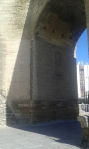 No pierdas de vista, por encima de ella, en la cara interna del arco, y también desdibujado, el escudo real.